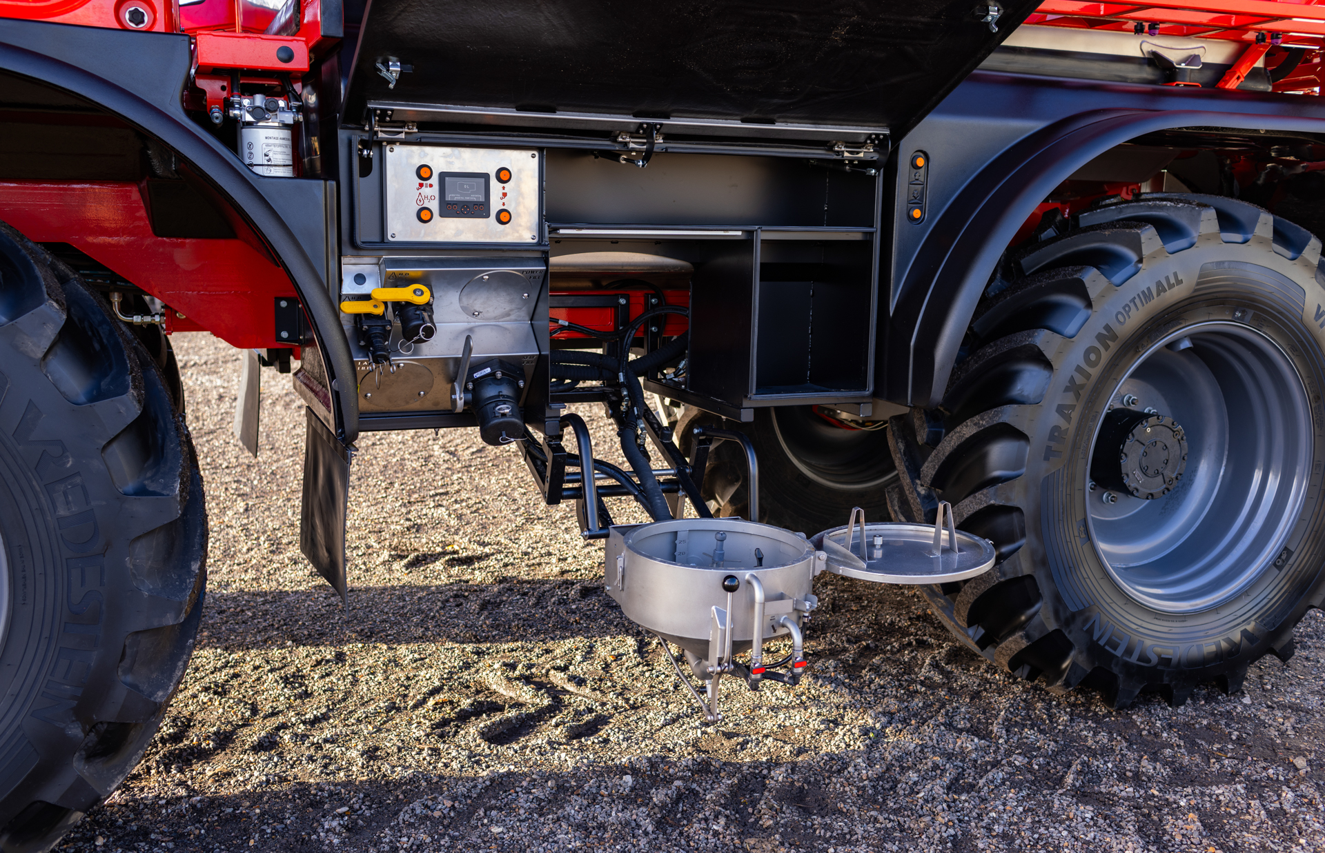 - Side-mounted 40 L powered stainless steel induction hopper with two wash nozzles and hand lance for convenient chemical loading.